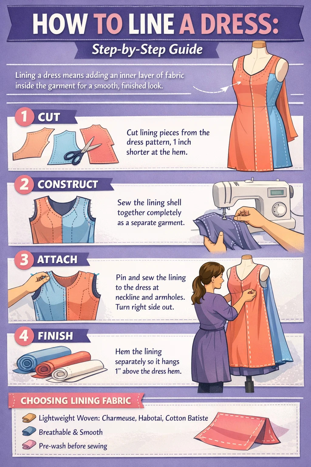 Karamihan sa mga mananahi sa bahay ay kumpletuhin ang isang pangunahing lining ng damit sa apat na yugto: gupitin, buuin, ikabit, at tapusin . Gumagamit ka man ng structured bodice o flowy skirt, pareho ang core logic. Ang mga pagbabago ay kung aling mga tahi ang una mong sasalihan at kung paano mo pinangangasiwaan ang laylayan.