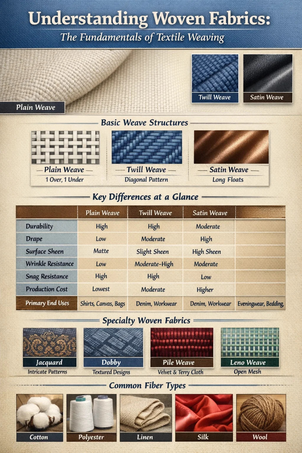 Mayroong tatlong pangunahing uri ng paghabi na bumubuo sa pundasyon ng halos lahat ng hinabing tela: plain weave, twill weave, at satin weave. Ang bawat iba pang pinagtagpi na istraktura — mula sa canvas hanggang velvet hanggang jacquard — ay hinango o binuo sa tatlong pangunahing kategoryang ito.